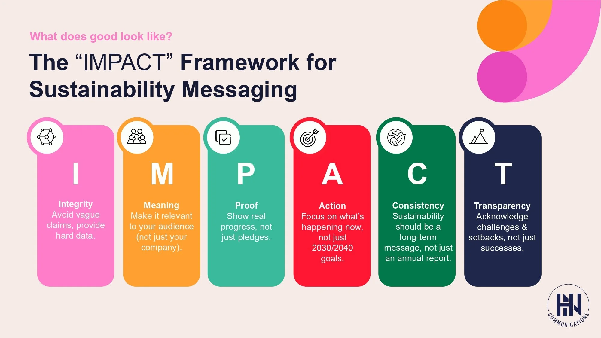 To help clients avoid those risks and build credible, future-ready messaging, we use our proprietary IMPACT framework. It’s the filter we apply to every sustainability strategy, campaign and executive message we shape.